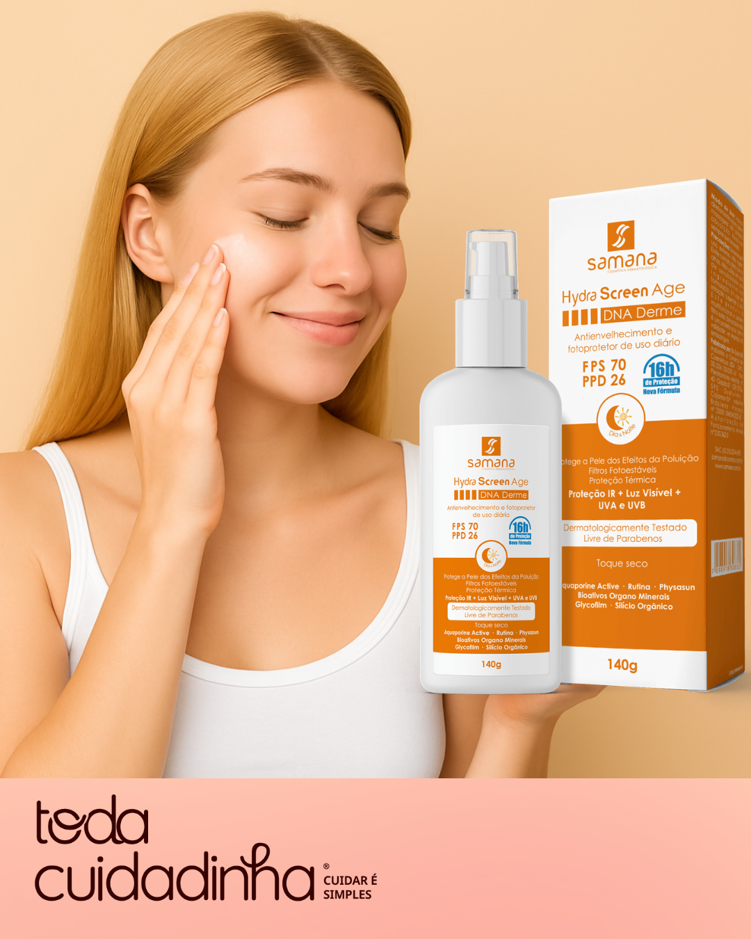 O Protetor Solar Facial Hydra Screen Age FPS 70 da Samana oferece alta proteção contra os raios UVA, UVB e luz azul, essencial para evitar o envelhecimento precoce da pele. Com PPD 26, este produto protege eficazmente contra os danos solares, prevenindo manchas, flacidez e mantendo a hidratação natural do rosto durante o dia.